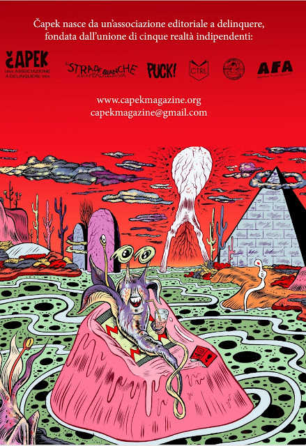 Sono passati due anni dal terzo numero, e la rivista autoprodotta Čapek torna con un volume di trecento pagine e la presenza di 106 autrici e autori da tutto il mondo. Questa quarta uscita ha come titolo "Guida Turistica agli Aldilà Possibili" e lo trovate in preorder dal 6 giugno al 6 luglio 2023 all’indirizzo www.capekmagazine.org. Verrá presentato a un evento domenica 18 giugno nei giardini della Libreria Scaldasole di Milano, assieme alla redazione di Čapek e alcuni degli artisti che vi hanno partecipato.